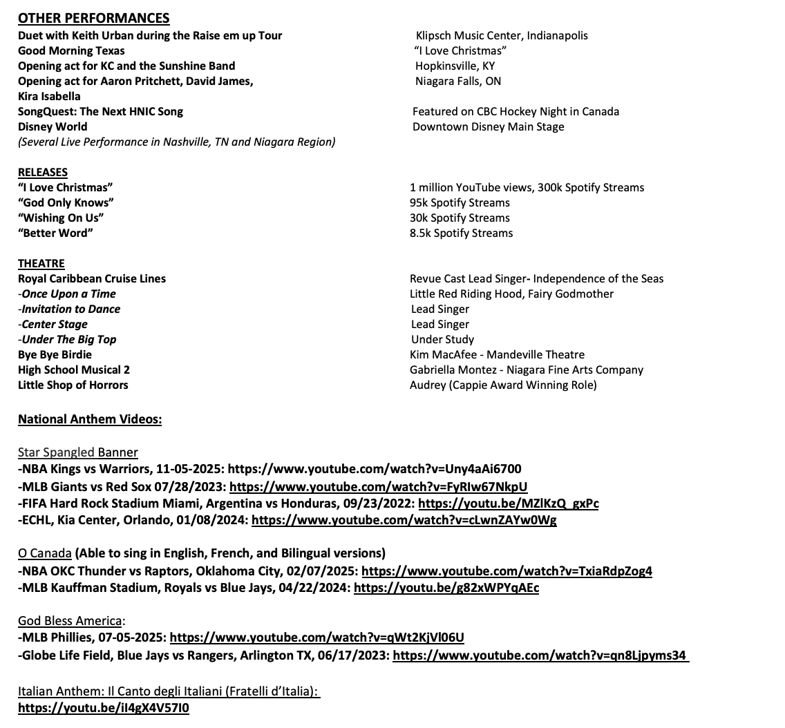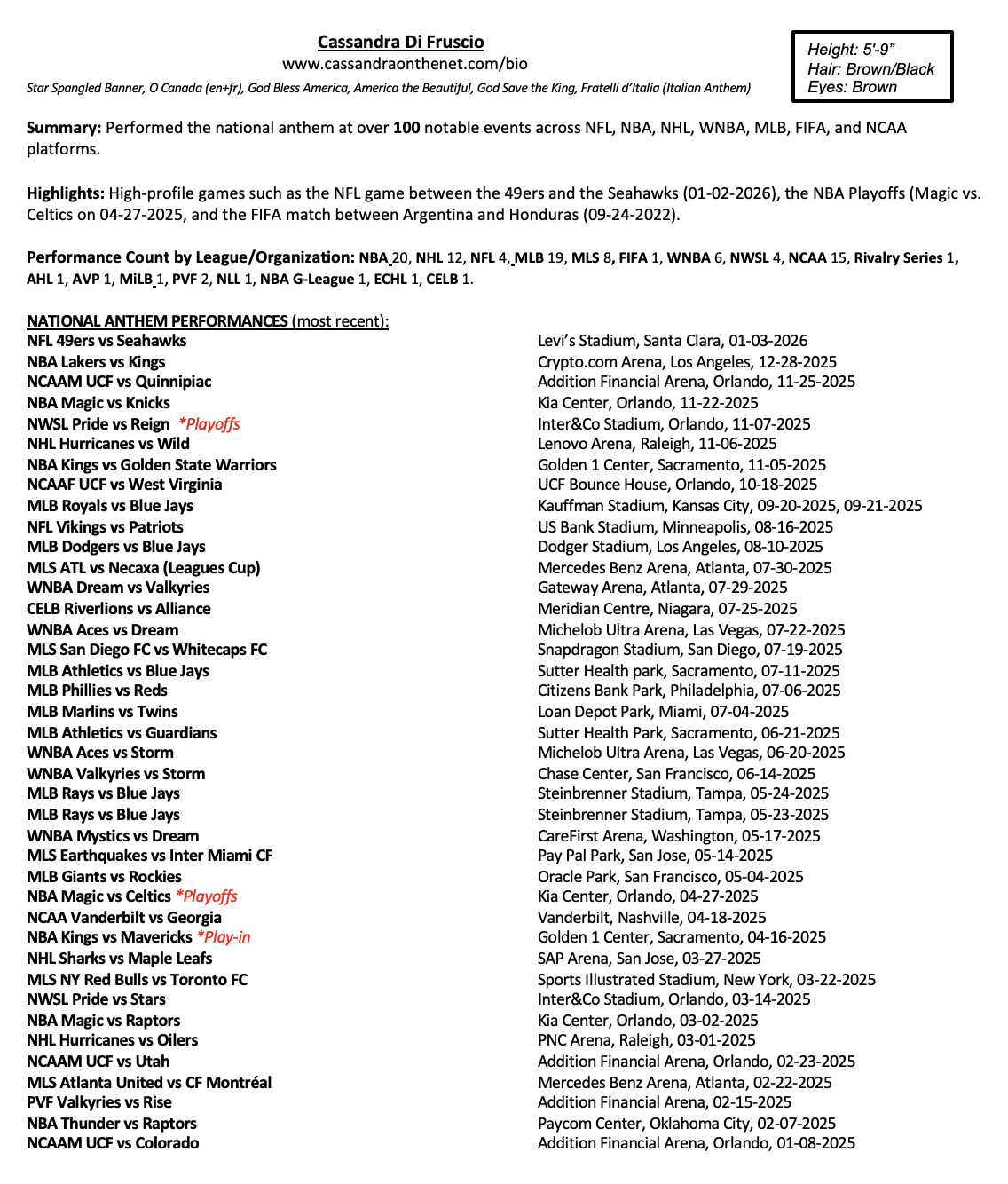 Performed the national anthem at over 100 notable events across platforms including NFL, NBA, NHL, WNBA, MLB, MLS, and NCAA.