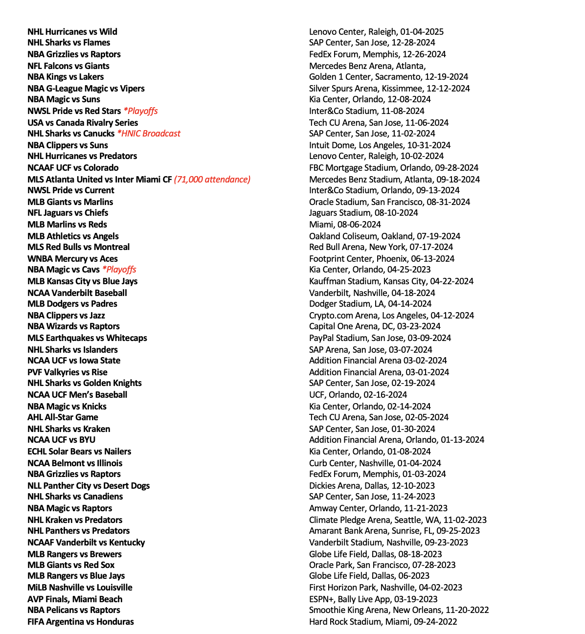 Highlights include performing at high-profile games such as the NBA Playoffs (Magic vs. Celtics on 04-27-2025) and the FIFA match between Argentina and Honduras (09-24-2022).